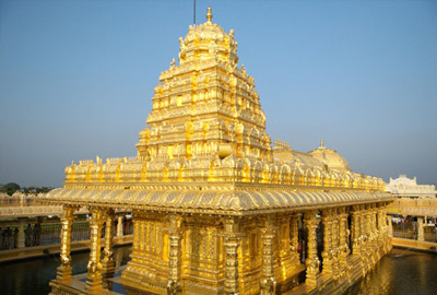 The golden temple of 'Sripuram' is a spiritual park situated at the foot of a small range of green hills in a place known as "Malaikodi" in the city of Vellore. This was inaugurated on August 2007. The salient feature of Sripuram is the Lakshmi Narayani temple or Mahalakshmi temple whose 'Vimanam’ and ‘Ardha Mandapam’ The temple is located on 100 acres of land and has been constructed by Vellore-based Sri Narayani Peedam, headed by spiritual leader Sri Sakthi Amma also known as Narayani Amma. The temple with gold covering, has intricate work done by artisans specializing in temple art using gold. Every single detail was manually created, including converting the gold chunks into gold foils and then mounting the foils on copper. Gold foil from 9 layers to 0 layers has been mounted on the etched copper plates. Every single detail in the temple art has significance from the vedas Sripuram design represents a star-shaped path(Sri chakra), positioned in the middle of the lush green landscape, with a length of over 1.8 km. One has to walk along the star path to reach the temple in the middle, which is laid by messages from Sri Sakthi Amma and from different faiths and spiritual leaders.